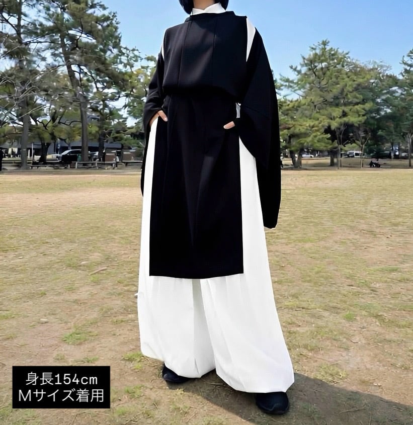 Stitching along the waist side prevents shifting and maintains a clean silhouette even during long wear. Slits from the hip to thigh allow excellent mobility reminiscent of Kariginu and Suikan. They also provide easy access to pockets—practical and stylish.