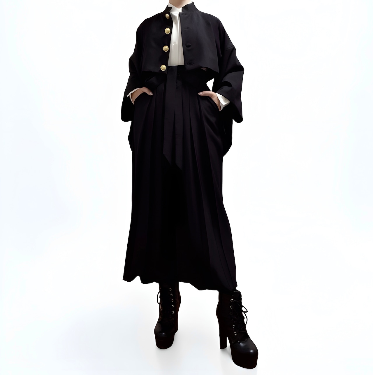 重厚感とカジュアルさを兼ね備えたブラックの袴パンツ。