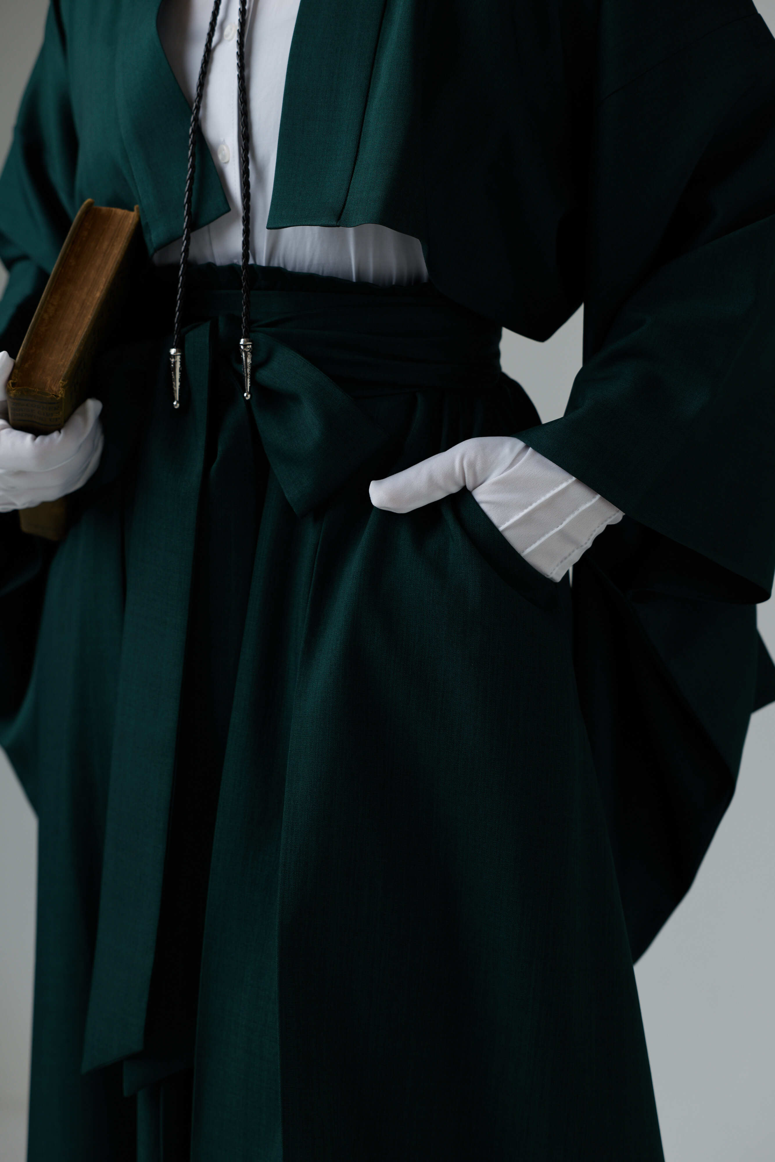 和装にも洋装にも馴染む、万能カラーで大人の品格を感じさせる深緑色の袴スカートです。