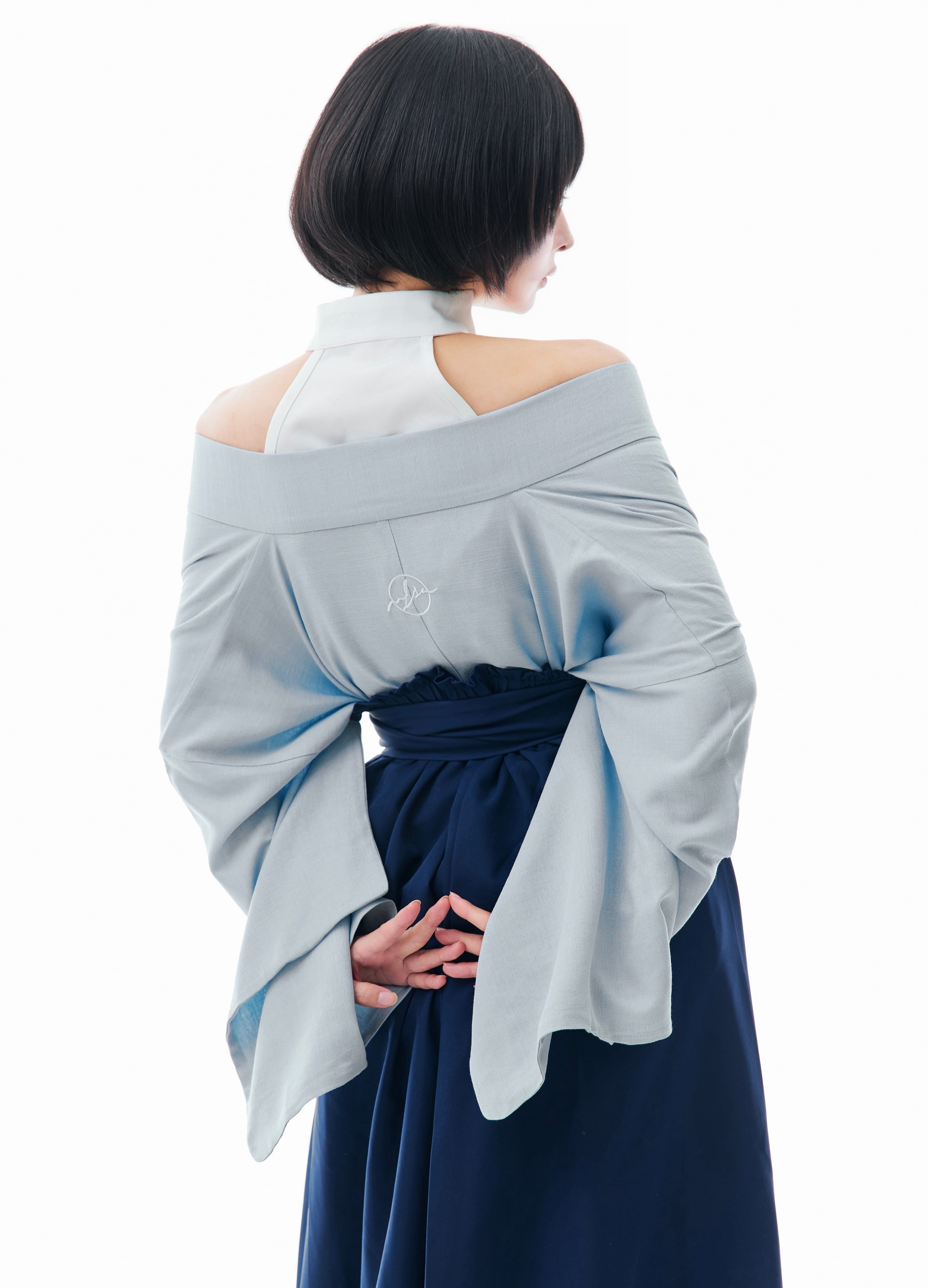 The embroidered crest on the back expresses a strong desire to expand the possibilities of kimono.