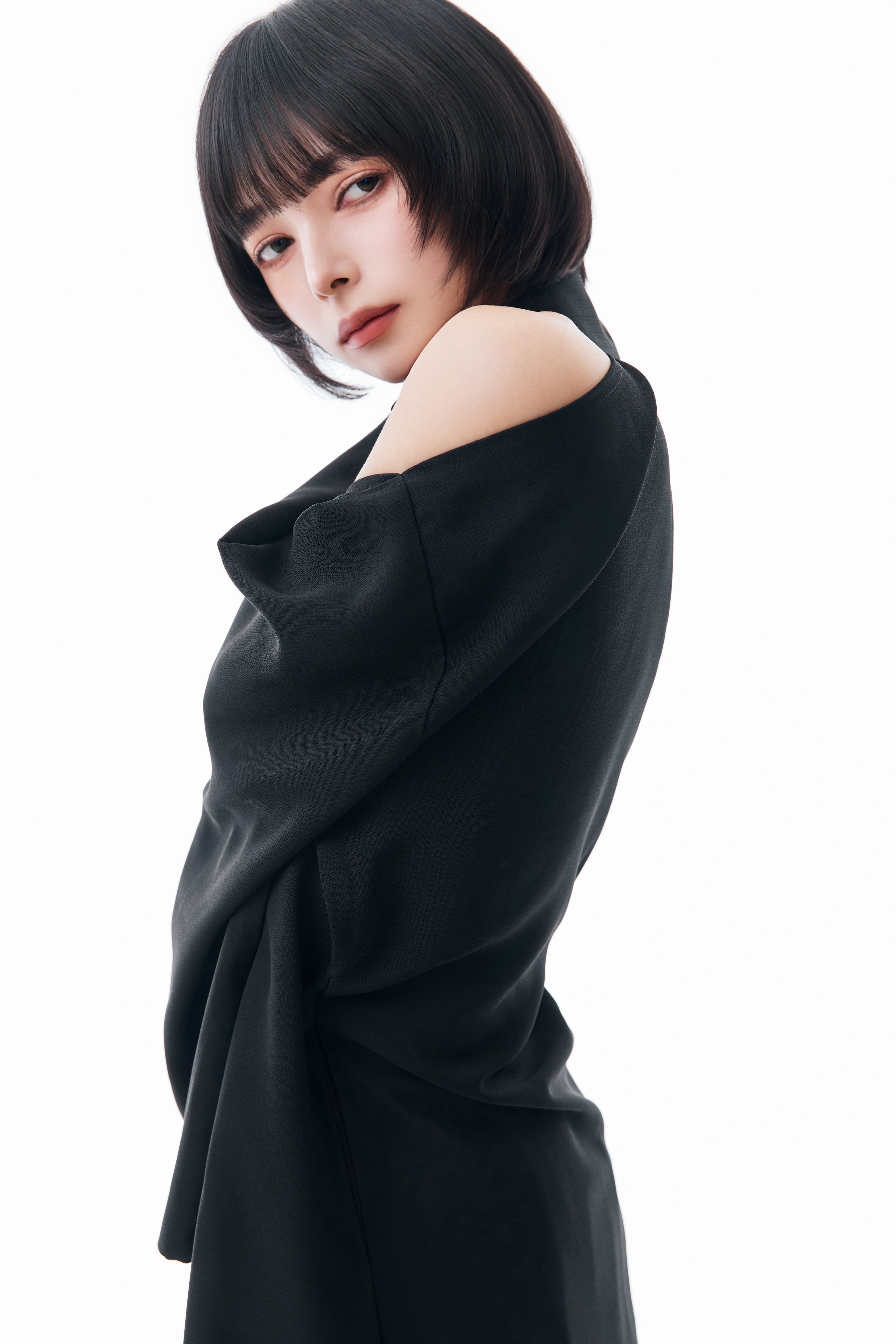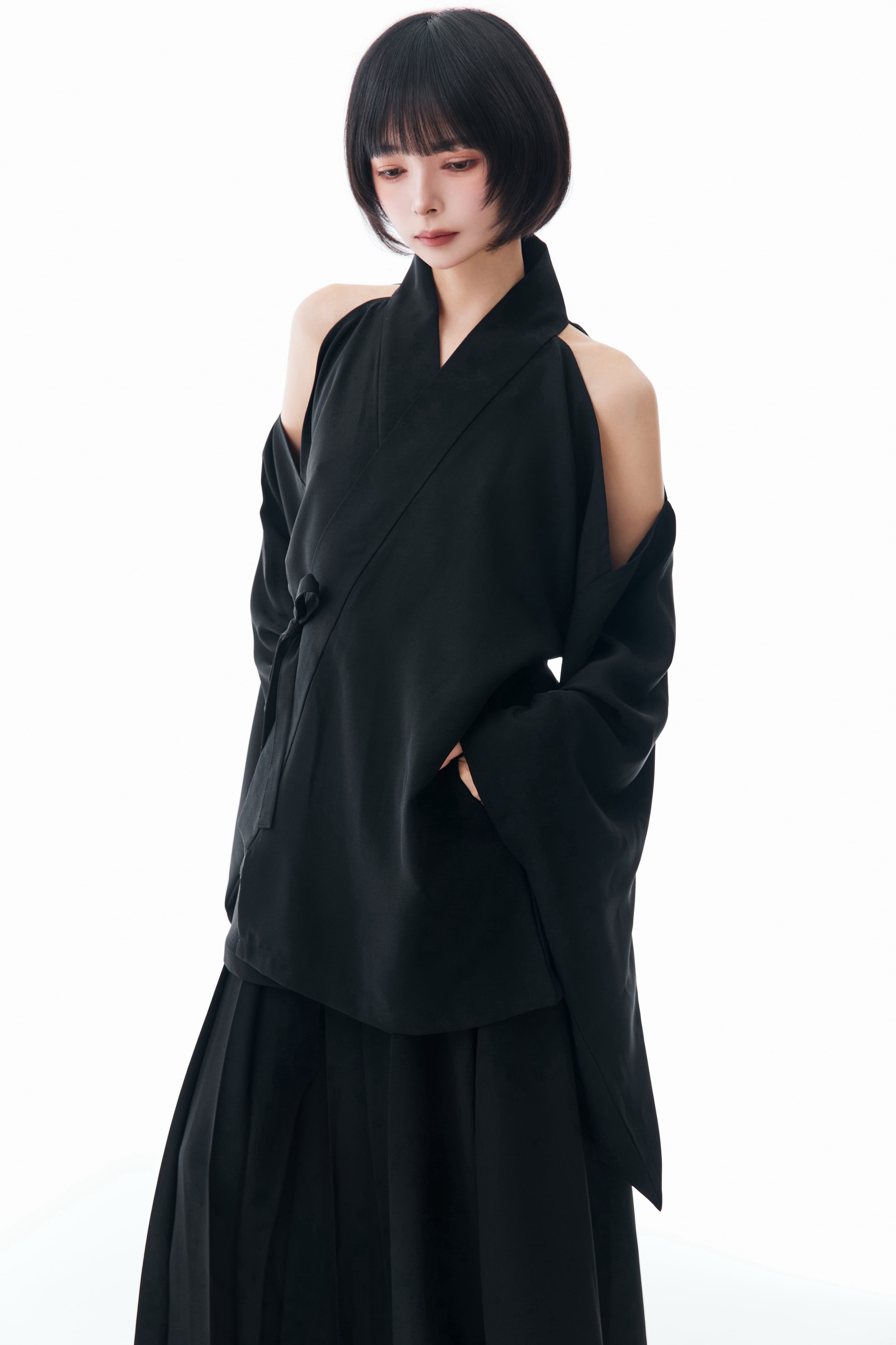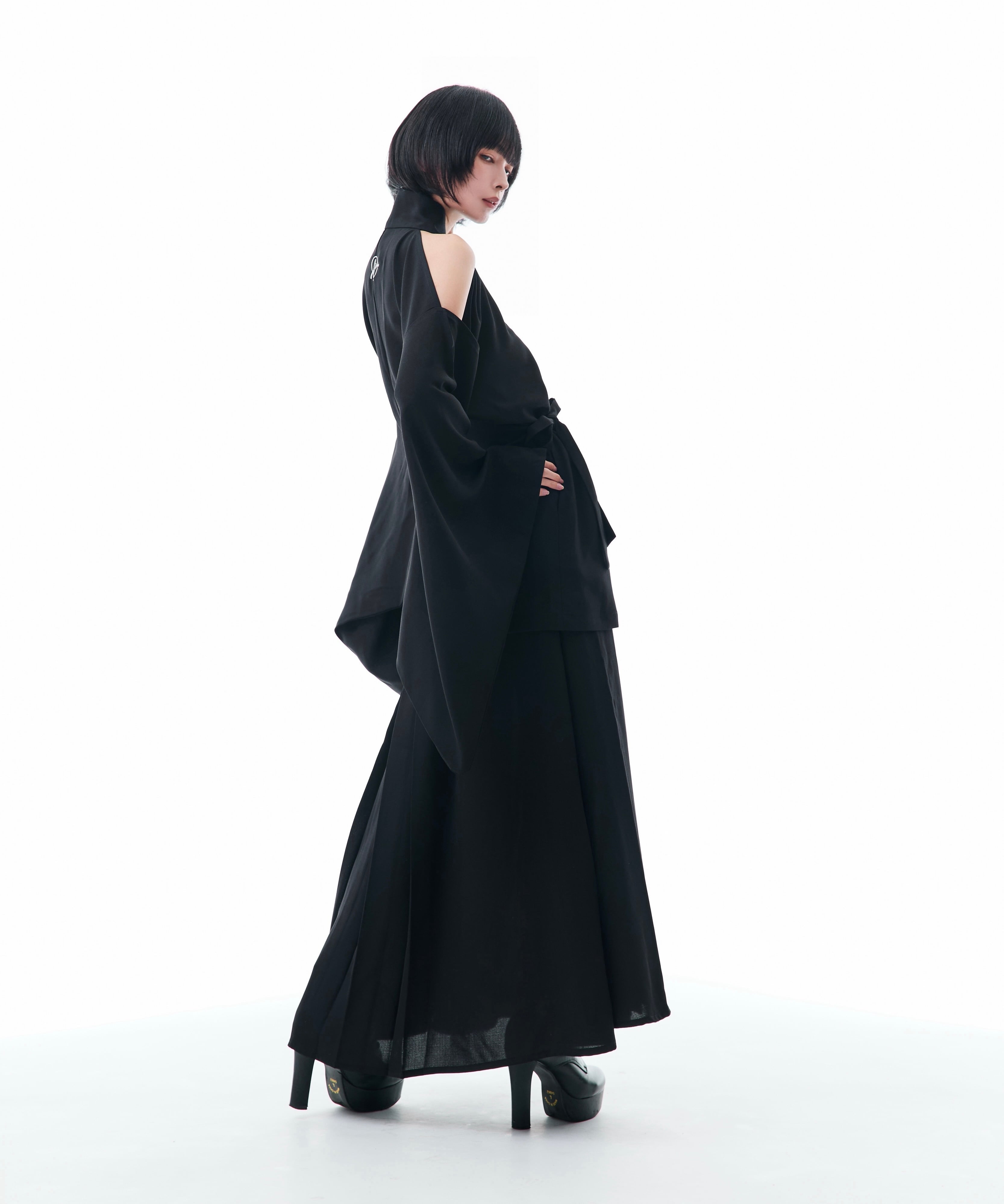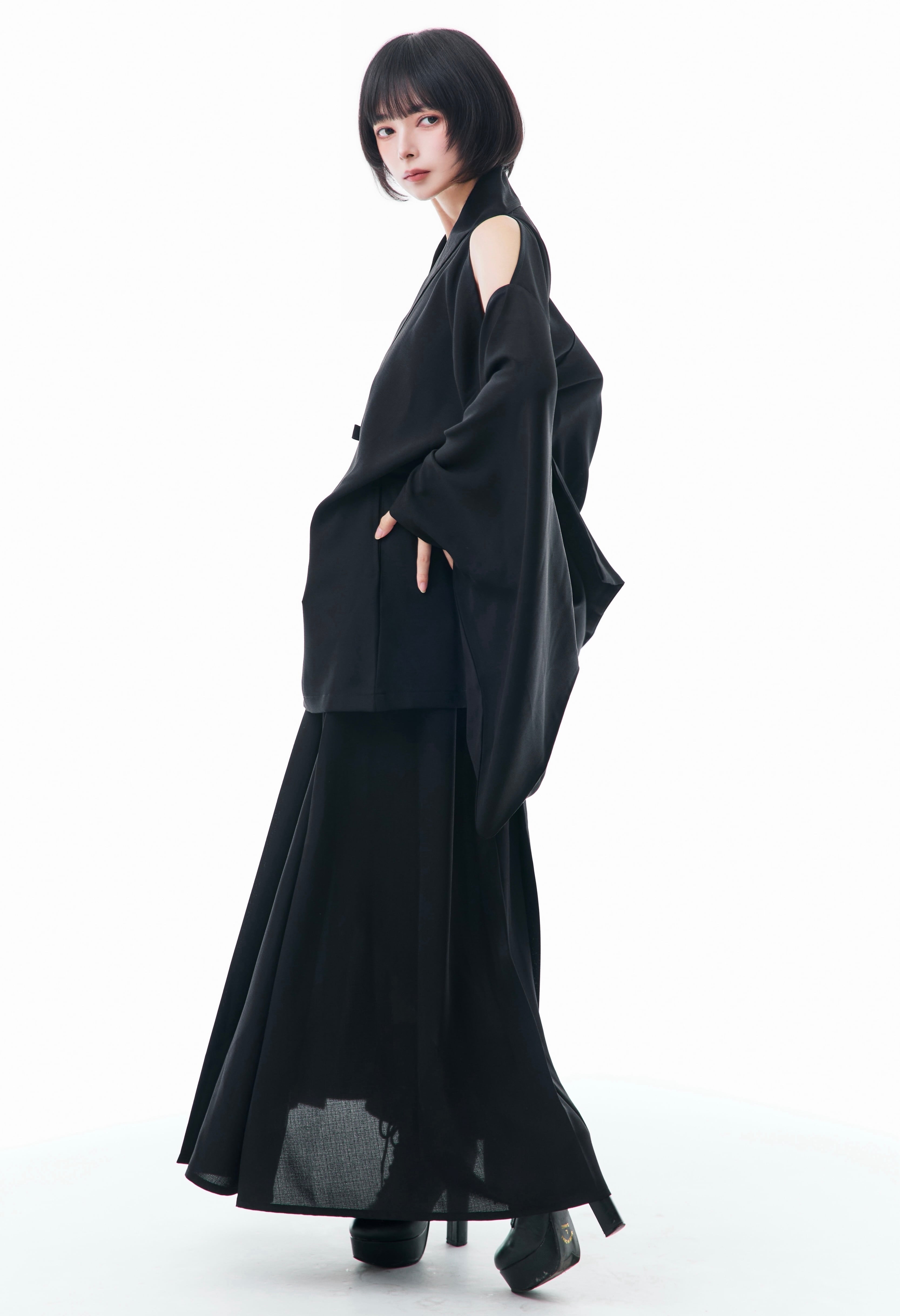 The shoulder cut design is inspired by the shoulder openings of Heian period kariginu and suikan.
