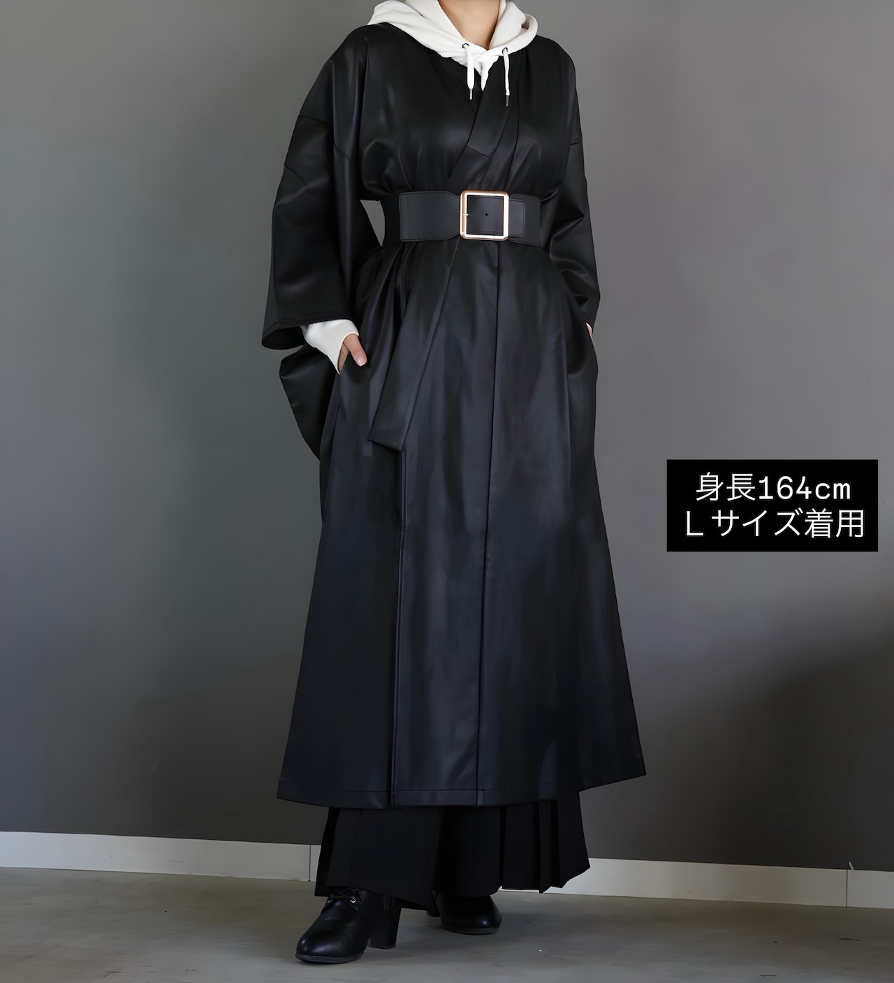 颯爽と歩けるデザインにこだわったフェイクレザーの着物コートです。