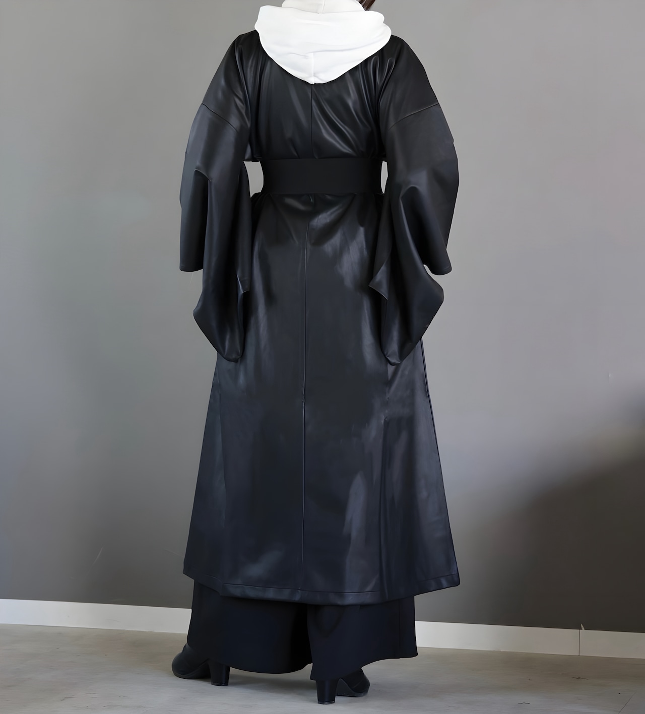 A faux leather kimono coat designed with a focus on a sleek silhouette for confident walking.
